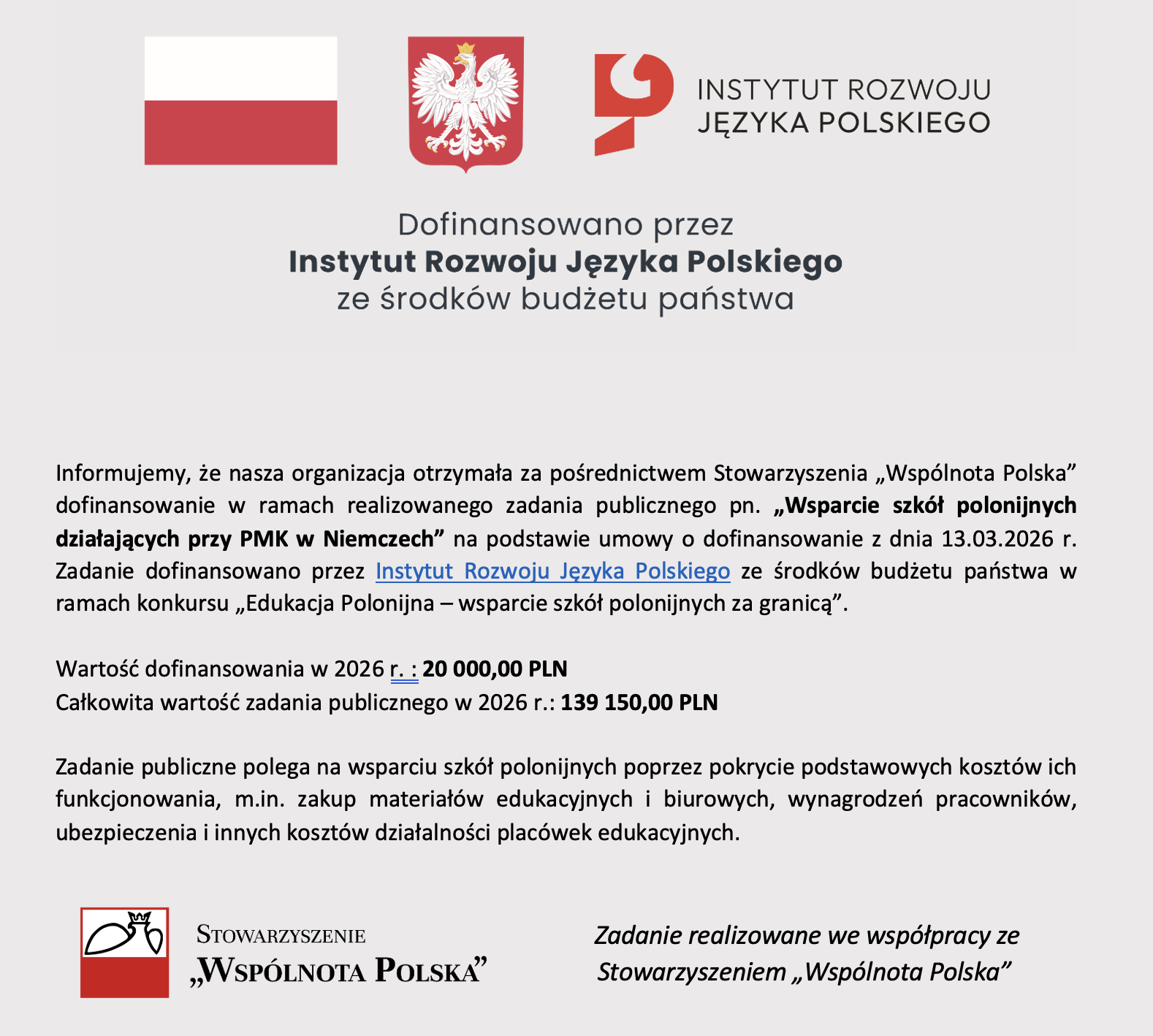 Informujemy, że nasza szkoła otrzymała za pośrednictwem Stowarzyszenia „Wspólnota Polska” dofinansowanie od Instytutu Rozwoju Języka Polskiego im. Św. Maksymiliana Marii Kolbego ze środków budżetu państwa w ramach konkursu: "Edukacja Polonijna- wsparcie dla szkół za granicą"...